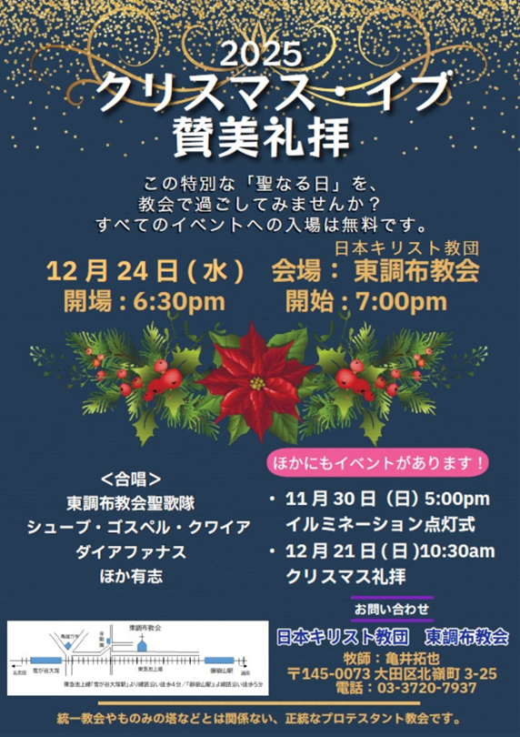 昨年に引き続き、ダイアファナス有志で、雪が谷大塚にある東調布教会さんのクリスマス・イブ 賛美礼拝に参加させていただきます。
